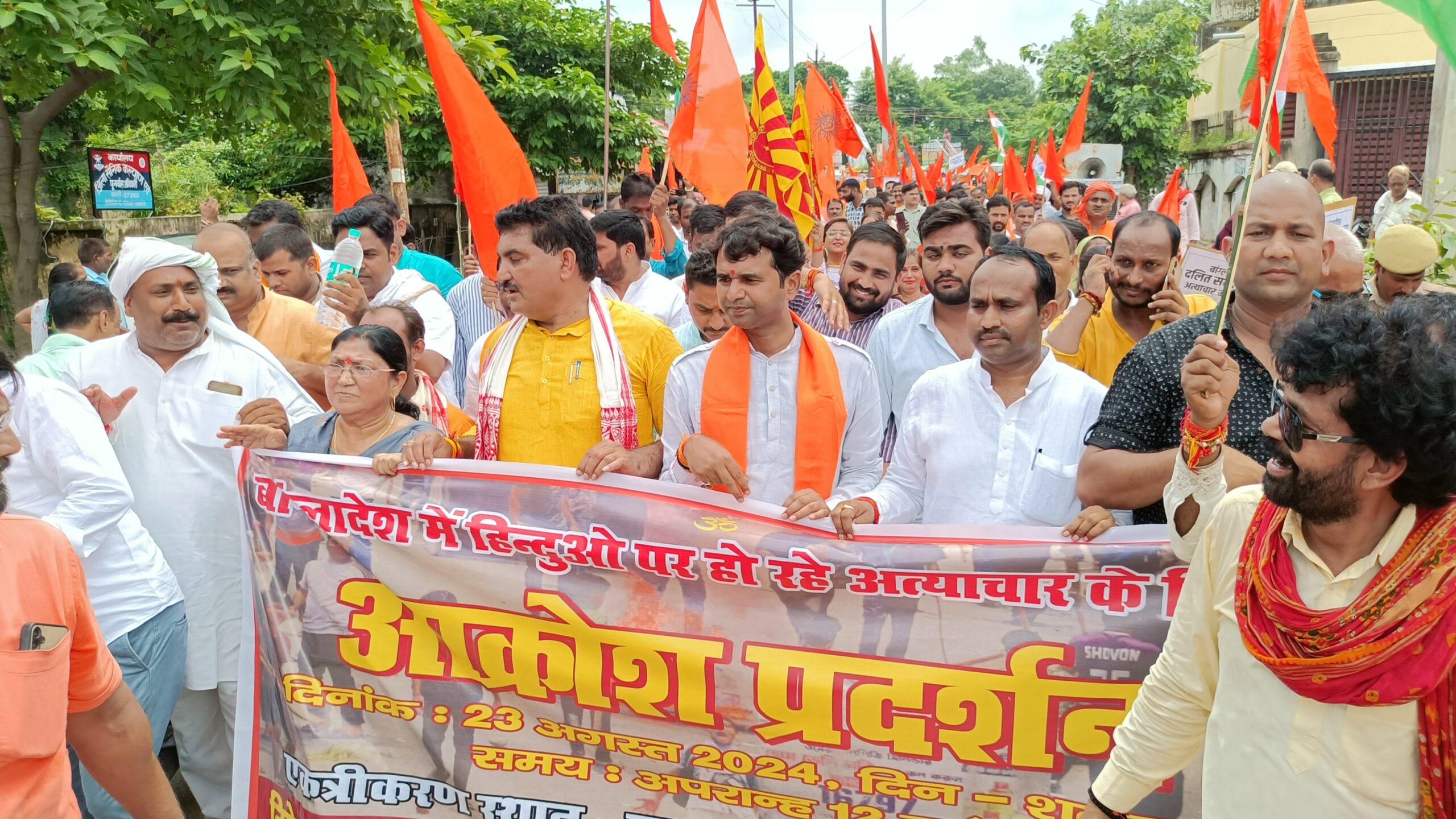 बस्ती: बांग्लादेश में हो रहे हिंदुओं पर अत्याचार के विरोध में जनपद के हिंदूवादी संगठनों ने मार्च निकालकर विरोध प्रदर्शन कर हिंसा को रोकने के लिए भारत सरकार से हस्तक्षेप की मांग की आपको बताते चले विगत कई दिनों से बांग्लादेश में हिंदुओं पर अत्याचार की घटनाएं बढ़ रही हैं क्योंकि तख्तापलट के बाद से ही लगातार बांग्लादेश अशांत है और वहां पर रह रहे हिंदुओं पर उत्पीड़न जारी है इसी के विरोध में आज पूरे शहर में विरोध प्रदर्शन करते हुए हिंदूवादी संगठनों ने मार्च निकाला इस अवसर पर हरैया विधायक अजय सिंह भाजपा जिला अध्यक्ष विवेकानंद मिश्रा वरिष्ठ भाजपा नेता अनूप खरे ओमप्रकाश आर्य नगर पालिका अध्यक्ष प्रतिनिधि अंकुर वर्मा दुष्यंत विक्रम सिंह प्रशांत सिंह गोपेश्वर त्रिपाठी पूर्व विधायक रवि सोनकर पूर्व सांसद अष्टभुजा शुक्ल पूर्व जिला अध्यक्ष पवन कसौधन व्यापारी नेता सुभाष शुक्ला समाजसेवी अखिलेश दुबे गोपेश पाल सुमन सिंह राजेश मिश्रा कैलाश नाथ दुबे मनोज सिंह सहित विश्व हिंदू परिषद भारतीय जनता पार्टी बजरंग दल सहित कई हिंदू संगठनों के पदाधिकारी और कार्यकर्ता मौजूद रहे।