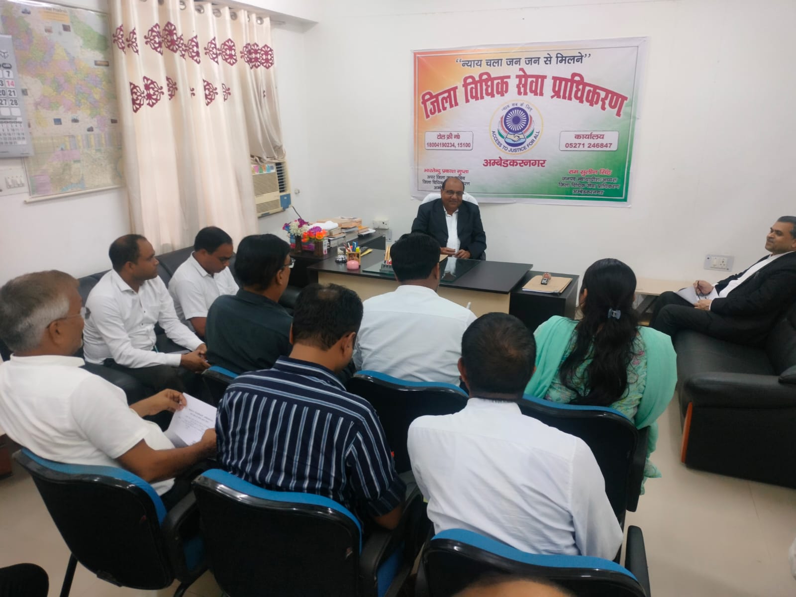राज्य विधिक सेवा प्राधिकरण, लखनऊ के निर्देशों के क्रम में राम सुलीन सिंह, जनपद न्यायाधीश / अध्यक्ष जिला विधिक सेवा प्राधिकरण, अम्बेडकरनगर के निर्देशानुसार दिनांक 14.09.2024 दिन शनिवार को जनपद न्यायालय, जनपद की समस्त तहसीलों एवं कलेक्ट्रेट परिसर अम्बेडकरनगर में आयोजित होने वाली राष्ट्रीय लोक अदालत की सफलता हेतु दिनांक 05.09.2024 को ए०डी०आर० भवन, जनपद न्यायालय, अम्बेडकरनगर में मोहन कुमार, विशेष न्यायाधीश पाक्सो अधिनियम / नोडल अधिकारी, राष्ट्रीय लोक अदालत की अध्यक्षता में एवं भारतेन्दु प्रकाश गुप्ता, अपर जिला जज / सचिव, जिला विधिक सेवा प्राधिकरण, अम्बेडकरनगर की उपस्थिति में आगामी राष्ट्रीय लोक अदालत में अधिक से अधिक संख्या में विभिन्न विभागों के प्री-लिटिगेशन वादों / प्रकरणों को नियत कर निस्तारित करवाने हेतु जनपद के विभिन्न विभागों कृषि विभाग, जिला पूर्ति विभाग, जिला समाज कल्याण, जिला प्रोबेशन, जिला पिछड़ा वर्ग, जिला दिव्यांगजन, खाद्य सुरक्षा एवं औषधि प्रशासन विभाग, भूमि संरक्षण, श्रम प्रर्वतन, प्रभागीय वनाधिकारी, एवं गन्ना विभाग के जिला स्तर के अधिकारी के साथ बैठक का आयोजन किया गया।