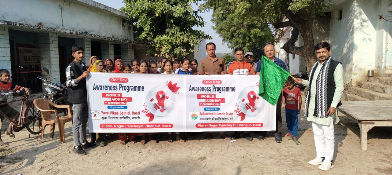 बस्ती: रविवार विश्व एड्स दिवस के अवसर पर युवा विकास समिति, रूरल अवेयरनेस फॉर कम्युनिटी इवोलूशन व विवेकानंद लोक विकास संस्थान के द्वारा जागरूकता संगोष्ठी व रैली का आयोजन भानपुर नगर पंचायत क्षेत्र के पंडित दीनदयाल नगर में संपन्न।