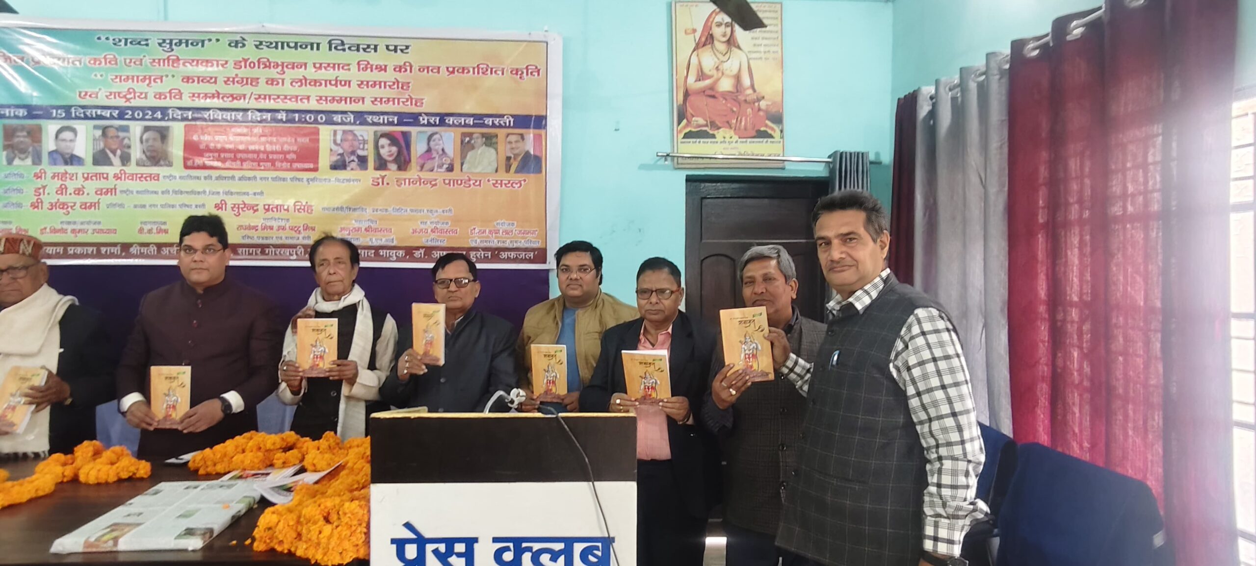 बस्ती । प्रेस क्लब सभागार में साहित्यिक संस्था शव्द सुमन द्वारा  वरिष्ठ साहित्यकार डा. त्रिभुवन प्रसाद मिश्र कृत ‘ रामामृत काव्य संकलन  का लोकार्पण  किया गया। इसी क्रम में राष्ट्रीय कवि सम्मेलन के साथ ही विशिष्ठ जनों को उनके योगदान के लिये सम्मानित किया गया।