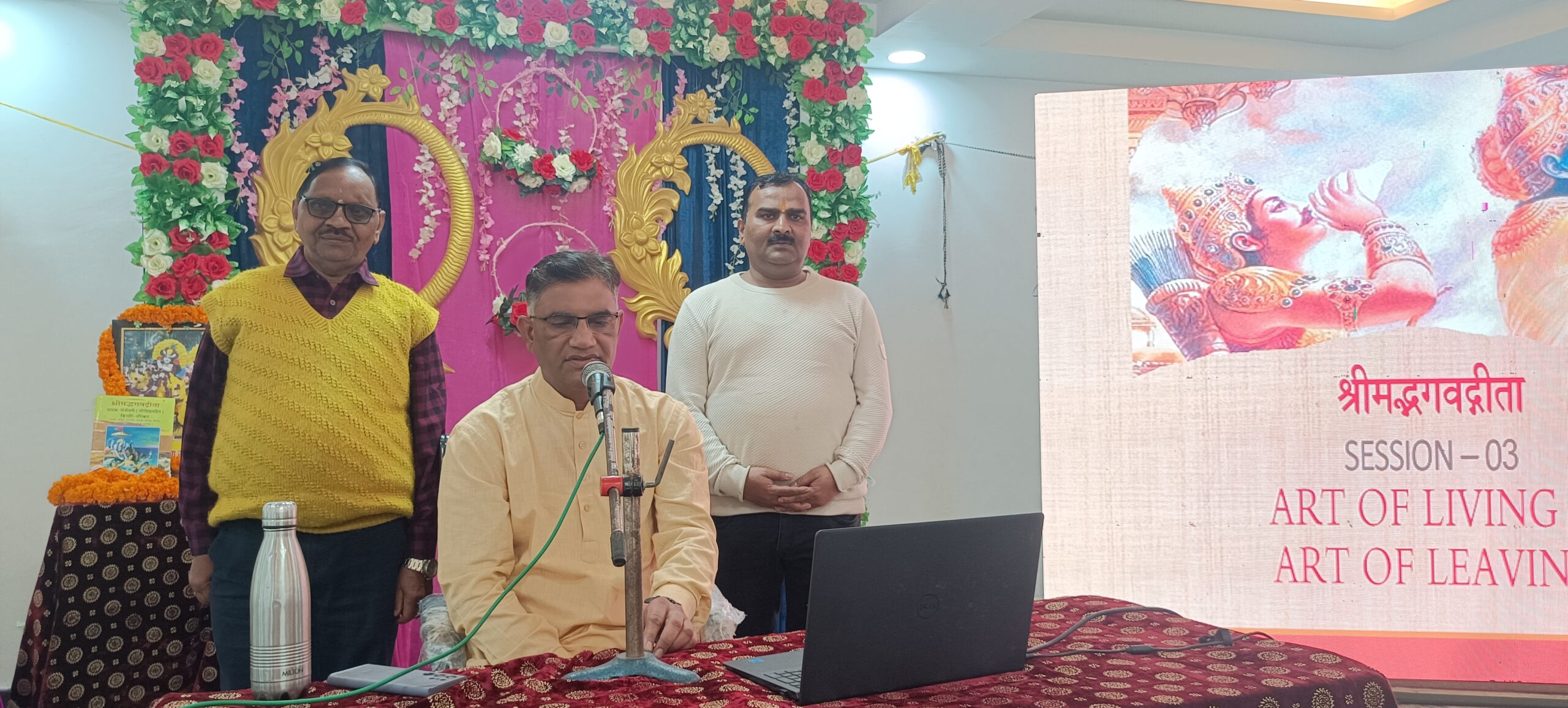 सेमिनार का शुभारंभ 9ः30 बजे से डॉक्टर पुष्पा के भजन ‘ऐसा क्या काम मैंने तेरा किया, जो तूने हाथ मेरा थाम लिया’ से प्रारंभ हुआ। इसके बाद एक से एक भजन प्रस्तुत किये गये। मुख्य वक्ता ने बताया गया कि गीता प्रचार से भगवान श्री कृष्ण अति प्रसन्न होते हैं और कहते हैं कि उसके समान ना कोई मेरा प्रिय है और ना होगा। लखनऊ से पधारे श्री जी लाल ने बताया की भागवत गीता वैक्सीन की तरह काम करती है। बाल्यकाल से ही इसके सानिध्य में रहना चाहिये। कम से कम प्रतिदिन हर व्यक्ति को 5 श्लोक अवश्य ही पढ़ना चाहिए।