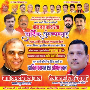 बस्ती।माँ शांति सेवा संस्थान द्वारा फुटहिया चौराहा, बस्ती में आगामी दिनांक 21 व 22 जुलाई को आयोजित होने वाले विशाल भंडारा एवं भव्य कावड़ महोत्सव 2025 के कार्यक्रम को लेकर तैयारियां शुरू हो गई है वहीं समाजसेवी एवं मां शांति सेवा संस्थान के अध्यक्ष तेज प्रताप सिंह सुड्डू ने बताया कि विशाल भंडारे में लाखों लोग प्रसाद ग्रहण करते हैं, और इस वर्ष भव्य कावड़ महोत्सव में भोजपुरी स्टार पवन सिंह एवं अभिनेता रवि किशन के साथ सांसद मनोज तिवारी आएंगे, आपको बता दे की मां शांति सेवा संस्थान के अध्यक्ष तेज प्रताप सिंह सुड्डू द्वारा हर साल भव्य कावड़ मोहत्सव एवं विशाल भंडारा का आयोजन किया जाता है, जिसमे इस बार 2 लाख भक्तो की सेवा का लक्ष्य रखा है। इसमें 21 जुलाई को पवन सिंह 22 को मनोज तिवारी आएंगे।इस अवसर पर लालजी यादव,हिंदू महासंघ के जिलाअध्यक्ष अखिलेश सिंह ,दिग्विजय सिंह राना, सौरभ त्रिपाठी,पंकज गोस्वामी के साथ अन्य गणमान्य लोग मौजूद रहे।
