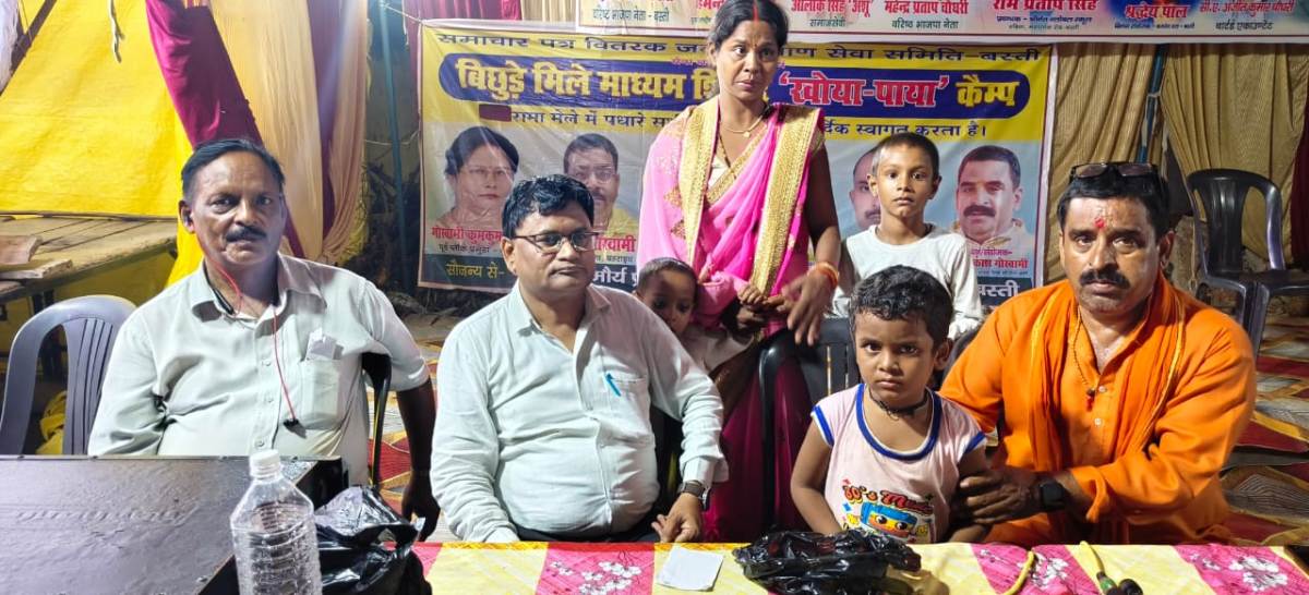 बस्ती । समाचार पत्र वितरक जन कल्याण सेवा समिति द्वारा जय प्रकाश गोस्वामी के संयोजन में कम्पनीबाग के निकट संचालित बिछडे़ मिले, खोया पाया माध्यम शिविर में दुर्गा पूजा मेले में अपने परिजनों से बिछडे 100 से अधिक बच्चों, महिला, पुरूषों को मिलवाया गया।