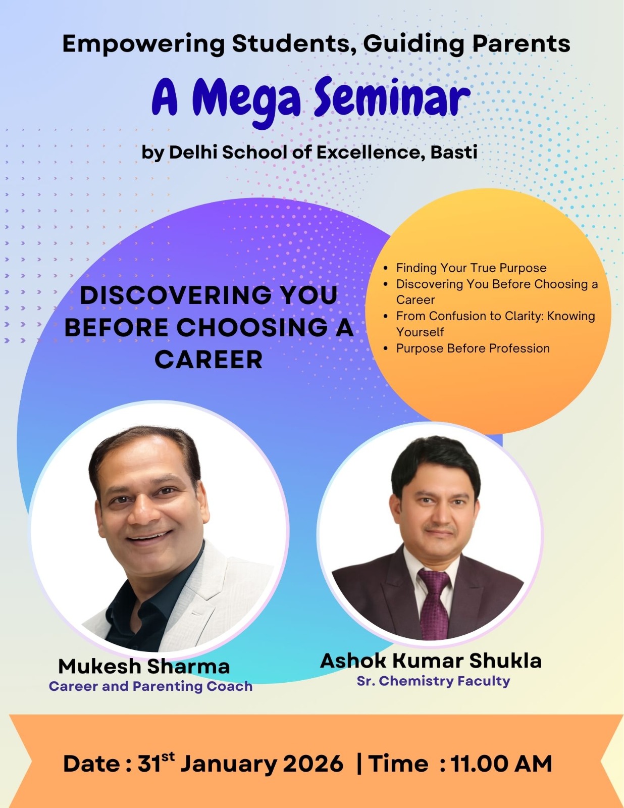 विद्यालय प्रशासन ने सभी अभिभावकों से अपील की है कि वे इस महत्वपूर्ण संगोष्ठी में अपनी गरिमामयी उपस्थिति दर्ज कराकर अपने बच्चों के शैक्षणिक एवं करियर निर्माण में सक्रिय सहभागिता निभाएँ।