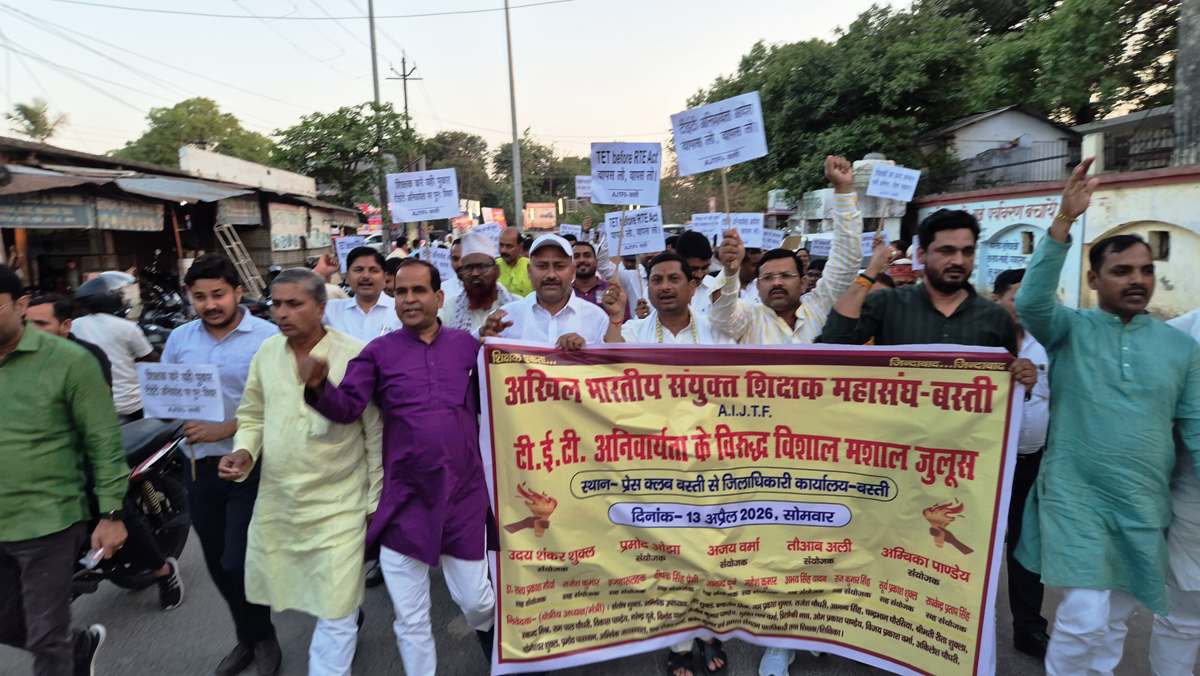 बस्ती। अखिल भारतीय संयुक्त शिक्षक महासंघ के आवाहन पर सोमवार को टेट के सवाल को लेकर मशाल जुलूस निकाला गया। इसके पूर्व प्रेस क्लब सभागार में शिक्षकों की बैठक हुई जिसमें परसुरामपुर ब्लाक अध्यक्ष नरेन्द्र दूबे के स्वागत के साथ ही संघर्ष की रणनीति पर विचार किया गया। टेट के सवाल पर शिक्षक प्रेस क्लब से हाथों में मशाल, मोमबत्ती और तख्तिया लिये शास्त्री चौक होते हुये जिलाधिकारी कार्यालय पहुंचे जहां उप जिलाधिकारी को प्रधानमंत्री और केन्द्रीय शिक्षा मंत्री को सम्बोधित ज्ञापन सौंपा गया।